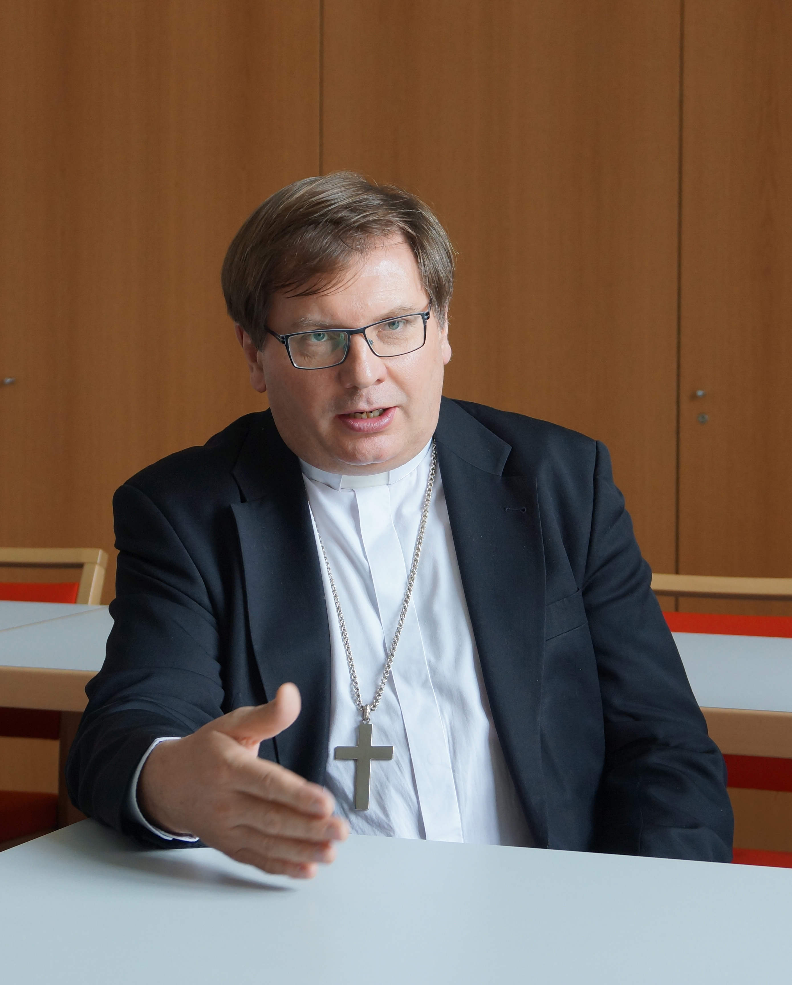 Synodalpräsident Otto Guse im Gespräch mit Bischof Dr. Fredrick O. Shoo (Tansania), Bischof Dr. Tamás Fabiny (Ungarn) und Bischof Dr. Carsten Rentzing. Aufgezeichnet am Rande der Frühjahrssynode der Ev.-Lutherischen Landeskirche Sachsens, am 9. April 2016.