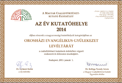 Az egyház Gyűjteményi Tanácsa nevében Kovács Eleonóra, a testület elnöke gratulált a díjhoz, megköszönve az intézmény eddigi munkáját. A köszönetek és méltatások között részletek hangzottak el a levéltárra szavazataikat adó kutatók leveleiből – soraik önmagukért beszéltek. Az orosházi evangélikus gyülekezet nevében Ördög Endre igazgató lelkész fejezte ki örömét. A Magyar Családtörténet-kutató Egyesület 2011-ben alakult a saját családjuk, közösségük történetét kutató személyek civil kezdeményezéseként. Azóta kiterjedt tevékenységet folytat, és igen aktívan működik. Jelenleg 694 tagja van. A szervezet amellett, hogy anyakönyvi adatok feldolgozásával adatbázisokat épít, konferenciákat, szakmai utakat is szervez, illetve a tagok véleményének megfogalmazásával igyekszik alakítani a családtörténeti kutatásokat is érintő törvénytervezeteket. Honlapján adattárakat és linkgyűjteményeket, speciális szótárakat és a kutatást segítő egyéb hasznos segédleteket tesz közzé.
