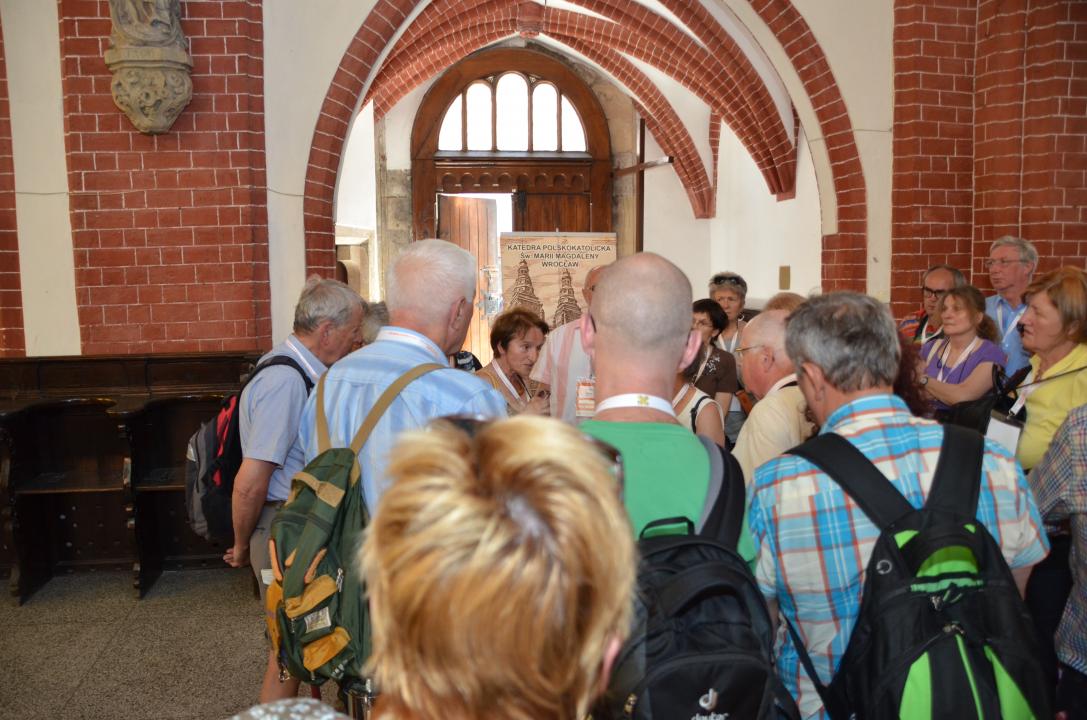 Az első nap délutánján csoportos városnézésre volt lehetőség. A templom mellett gyülekező egyik német cosporthoz társultunk, akik a protestáns Wroclawot szerették volna megismerni. Idegenvezetőnk, akit Jadwigának hívtak, kedvesen köszöntött bennünket, majd a templom árnyékos oldalára húzódtunk ismerkedni. Elmondta, hogy ő maga katolikus, így a reformáció konkrétumairól nem fog tudni beszámolni, de sétánk folyamán megpróbál olyan helyekre elvinni bennünket, amelyek a protestantizmust mutatják be.