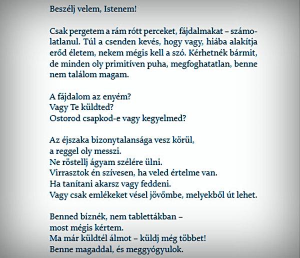 – Jöttek olyan bátorítások, hogy „Higgy, bízzál, és akkor meggyógyulsz!” Nagyon erősen tiltakoztam ezek ellen, nem tudtam ezt elfogadni. Betegségem alatt Istennel is ugyanúgy vitatkoztam, mint az orvosokkal, vagy a látogatóimmal. Lutherre utalva mondhatom, hogy a hadakozás során a rejtőzködő Istennel találkoztam. Hiszem, hogy a betegség gyötrelmei alatt Ő ott volt a háttérben. Nem adott közvetlen bátorítást, nagyon rejtve mozgatta a szálakat, de ott volt. Úgy tudtam a hitben megerősödni, hogy elfogadtam: ha nem is látom mindig a keze munkáját, Ő akkor is ott van. Erre a rejtőzködő Istenre ráhagyhatja az ember magát, legyen bármilyen kétségbeesett helyzetben is.