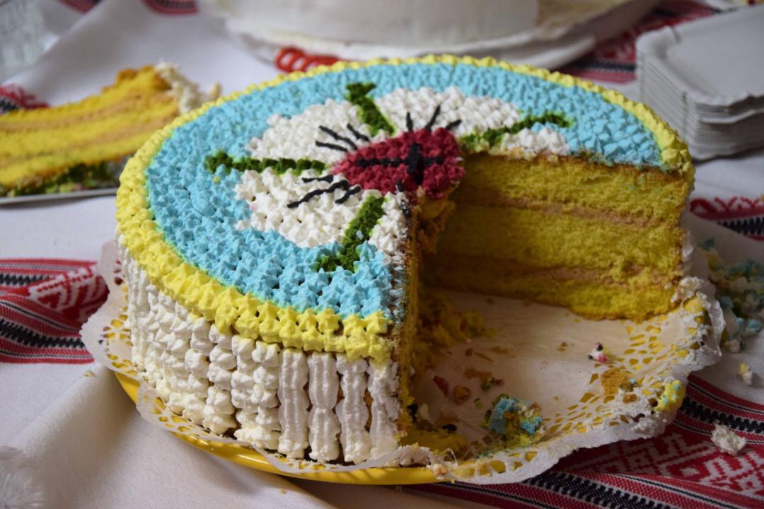 „A képen vanília krémes, fondant bevonatos torta látható.