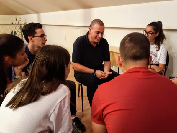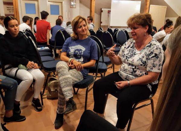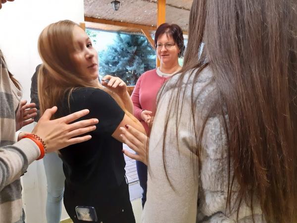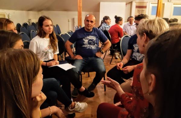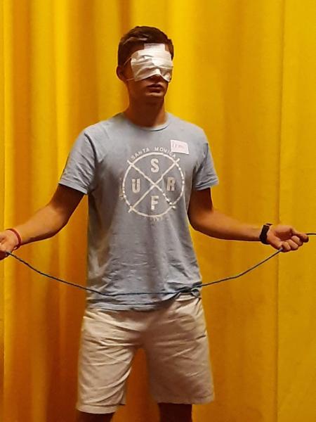A lelkész a második nap reggeli áhítatát a résztvevőket is megmozgató gyakorlatokkal is színesítette (bizalomjáték, csoportpiramisok építése).